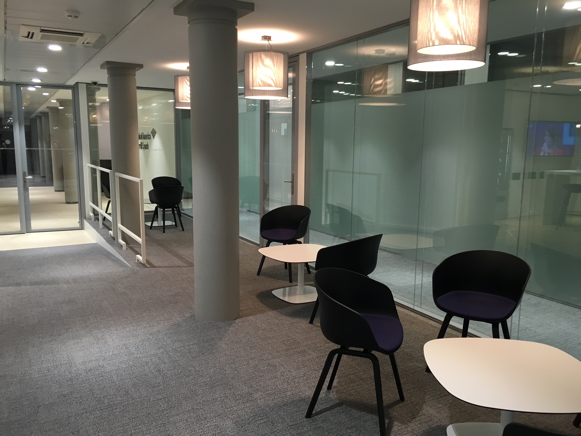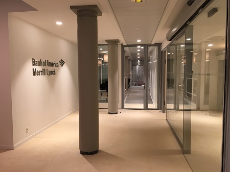 Rénovation complète, et réaménagement d'un bâtiment tertiaire comprenant un accueil, des salles de marché, des bureaux, des salles de réunion pour le compte de la BAML (Bank Of America Merrill Lynch).